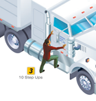 به پله های بدنه کامیون خود بروید. با یک پا بالا بروید و با پای دیگر عقب و بالا بروید. در صورت نیاز به کمک (زانوهای) از دسته کنار کابین خود برای حفظ تعادل و حمایت بیشتر استفاده کنید. به یاد داشته باشید که تا جایی که ممکن است از پاهای خود استفاده کنید و از بازوها استفاده نکنید. ۱۰ بار تکرار کنید.